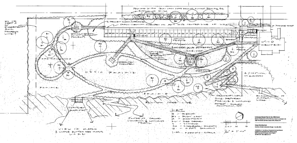 The current landscape plan has been developed by Terry Marvel of Terraforma Inc for the WILD Center with input from the WILD Center Advisory Committee and is a working document. The landscaping will be developed over a period of years as we have money, volunteers, donations and management available to make it happen. The plan may also see some minor changes made over the years as a result of climate change and/or as new information becomes available to WILD Center and Wild Ones management.