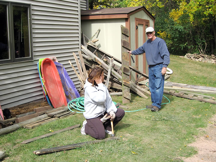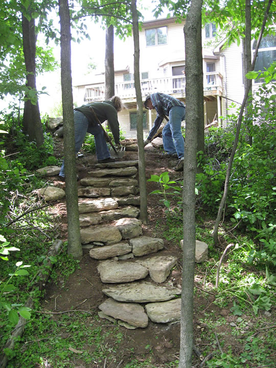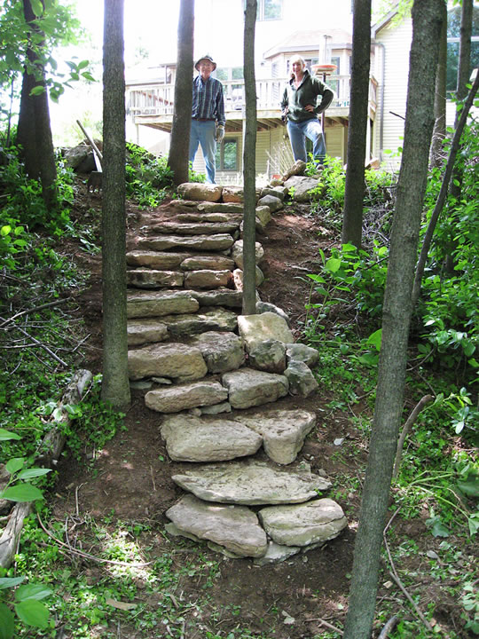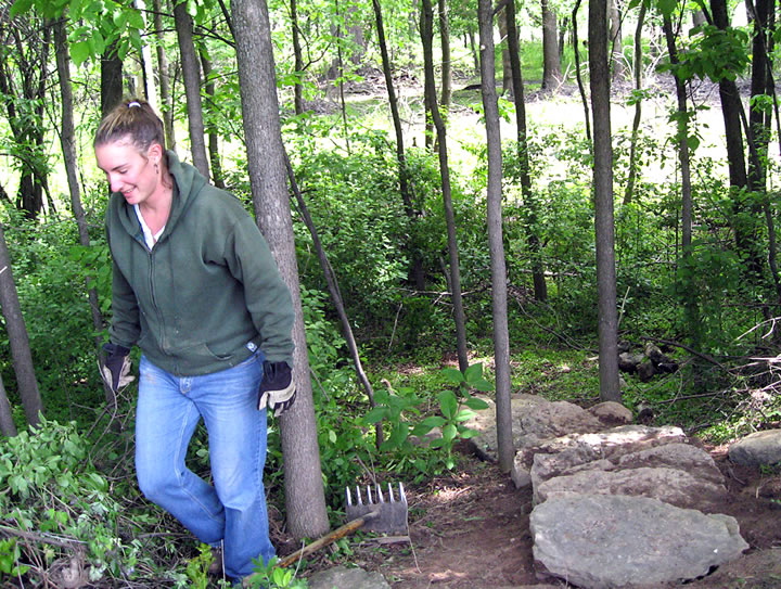 Site Coordinator Lisa Picconi and Wild Ones member Dave Edwards constructed steps, using sand stone leading from the raingardens to the lower level of the riparian woodland. Now only the buckthorn stands in our way of accessing the woodland and marsh. Volunteers Ann Drzewiecki and Rob VanZeeland making benches so visitors can enjoy the views. Dave Edwards built and installed a rain barrel.